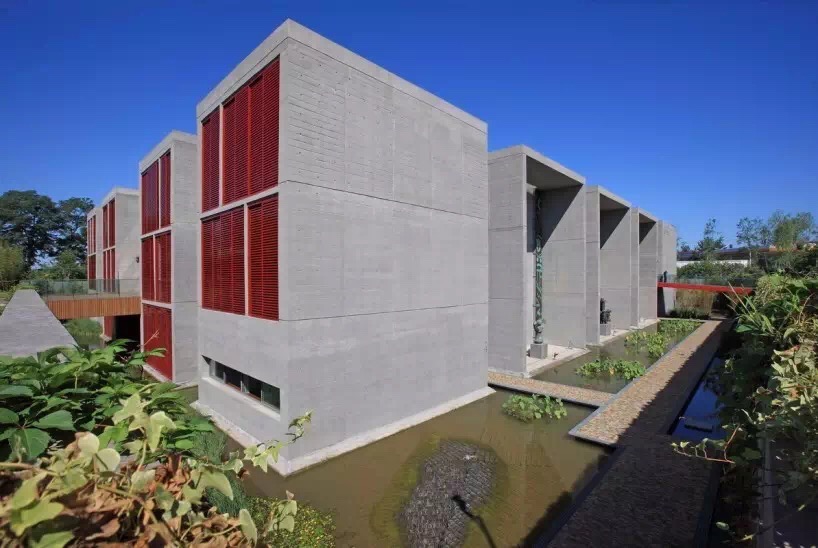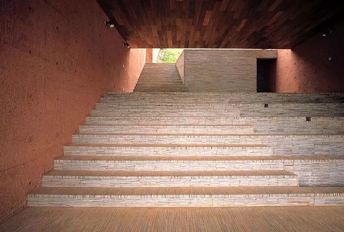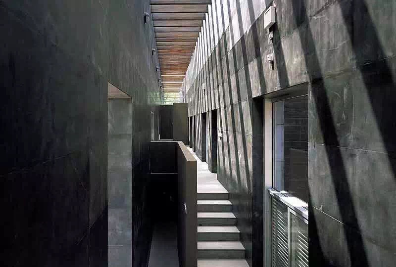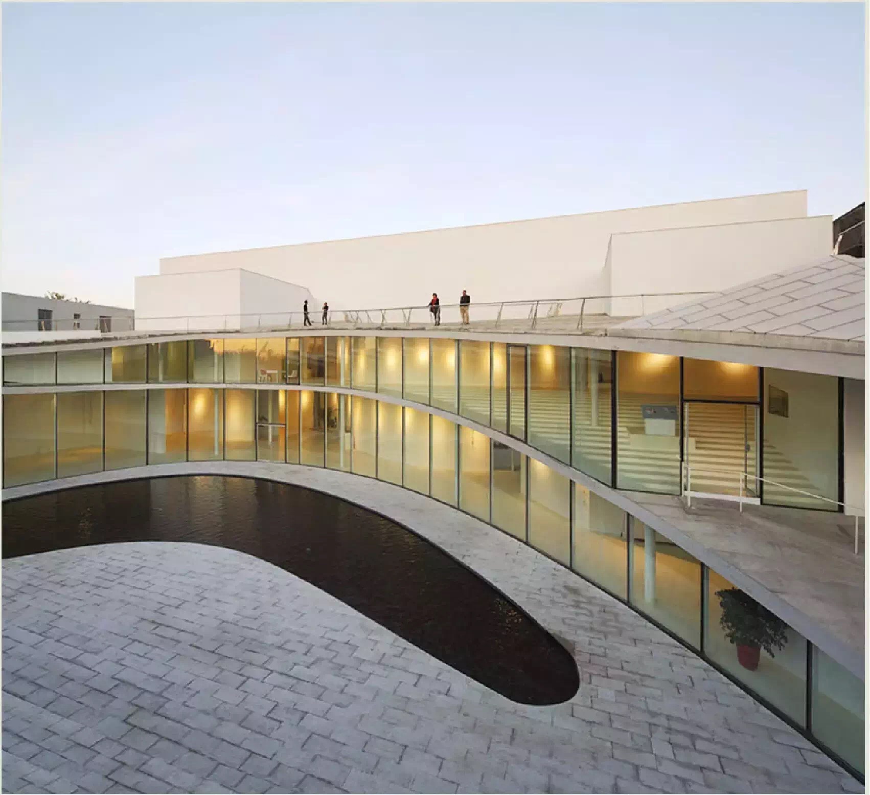 院的水池吸引,经过平静的水面过滤掉外界的心绪,进入一层的展厅。天空也被映射到地面上来,让人不经意忘掉外界的环境。第一个庭院由一堵暴露的混凝土墙体将外界的马路,灰尘隔离开来。在这里人们可以选择坐在庭院的树下聊天,或是给水池里的鱼儿喂食,透过巨大的幕墙可以看到室内的艺术品和人在室内游走。在裸露的混凝墙土墙体的内部是一个微妙变化着曲率的走廊,可以作为书廊或者展示一些绘画和小型雕塑。