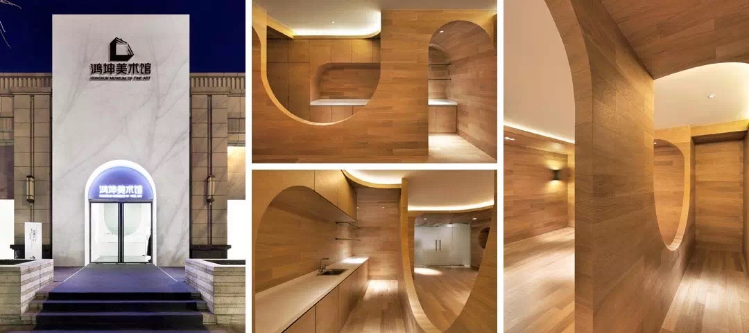 鸿坤美术馆是由两位80后国际新锐青年建筑师孙大勇、Chris Precht合作创立的槃达建筑(penda)新近完成的一个相对成熟又具有实验性的项目。位于北京朝阳区西大望路, 白色的外立面在纷乱繁杂的街道环境中十分醒目。两位建筑师对美术馆的概念进行了深入研究,美术馆的本质是对艺术品的保存与呈现的空间。最原始的史前艺术绘画是发生在洞穴中的,如法国发现的拉斯科洞窟被称为“史前卢浮宫”。同时,洞穴也是建筑的原型之一,后来罗马建筑中的 “拱券”便是洞穴结构的一种发展,而且在上千年的建筑传承中,拱券一直被讨论与应用。因此美术馆中选择了 “拱”这一母题进行艺术馆空间的重塑,利用“拱”作为载体,创造了一次古典与现代的对话。经典的拱门像是生活与艺术间一道门,穿过它便进入了另外一个世界。拱形雕塑着空间,视线随着蜿蜒的弧线起伏移动。如同欣赏山水画一般,意境油然而生。因为从艺术欣赏的角度来讲,观者欣赏一幅艺术作品,是视线在跟随线条移动。这个移动的轨迹的韵律性越强,审美的愉悦性也越强。所以这种连续性空间也非常容易吸引人的关注和思考。这对于一个艺术展览空间的入口,显得格外重要。