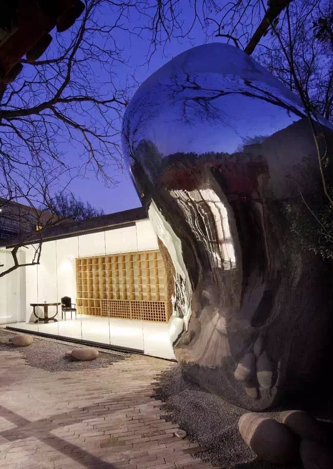 四合院和胡同是旅游的好去处,因为那里最有老北京的市井烟火气。但随着建筑的逐渐老旧、混乱的搭建,甚至卫生设施的缺乏,这些老房子逐渐被淘汰。怎样改造一下这些老房子,让他们重新焕发生机呢?建筑师马岩松和党群选择在老城区里“吹泡泡”。第一个“泡泡”出现在北兵马司胡同 32 号的小院里,“泡泡”里面其实是一个加建的卫生间和通向屋顶平台的楼梯,为老城区里的居民补建了最基本的卫生设施。“泡泡”外面是金属曲面,反射着天空和树影,像是一个光怪陆离的关于未来的梦境。植入四合院胡同里的泡泡是 MAD 城市概念作品“北京 2050”中的一部分。通过这些像水滴一样散落在北京四处的泡泡,设计师想要提醒人们关注日常生活的改善和社区生活的重建,以简单、自然且“可繁殖”的方式,在保留传统的基础上,实现整体社区的复苏。
